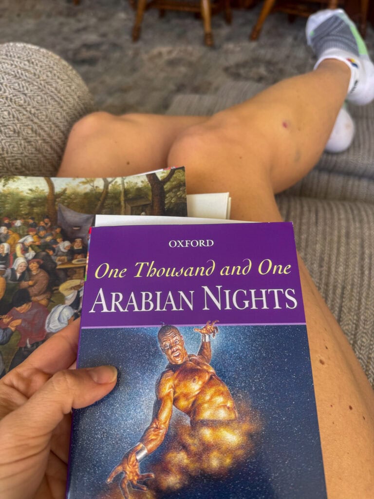 Currently we are reading 1001 Arabian Nights as part of unit on the Islamic Golden Age. It’s quite entertaining as it’s about the clever woman, Shahrazad, telling tales nightly to her husband the king in order to enthrall him and keep him from chopping off her head each morning. There are more details to that, of course, but that’s the premise.